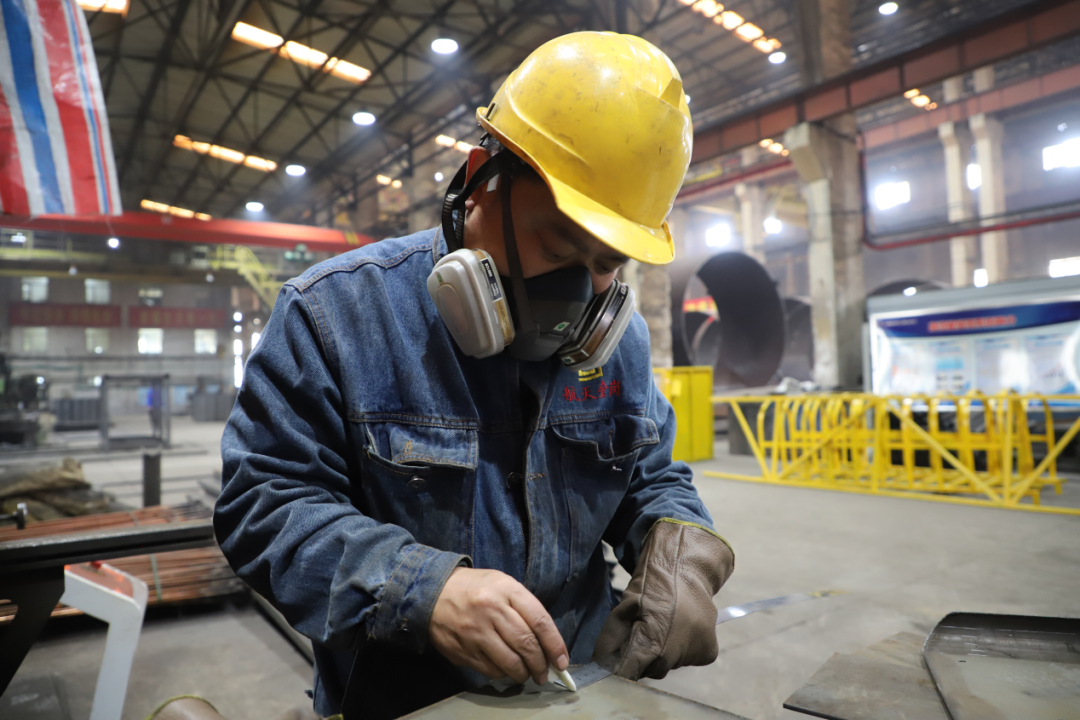 金崗重工新能源裝備制造中心冷作工組職工嚴(yán)格按照操作流程與圖紙尺寸,對(duì)鋼板進(jìn)行測(cè)量、劃線與折彎,力求保質(zhì)保量圓滿交付生產(chǎn)任務(wù)。