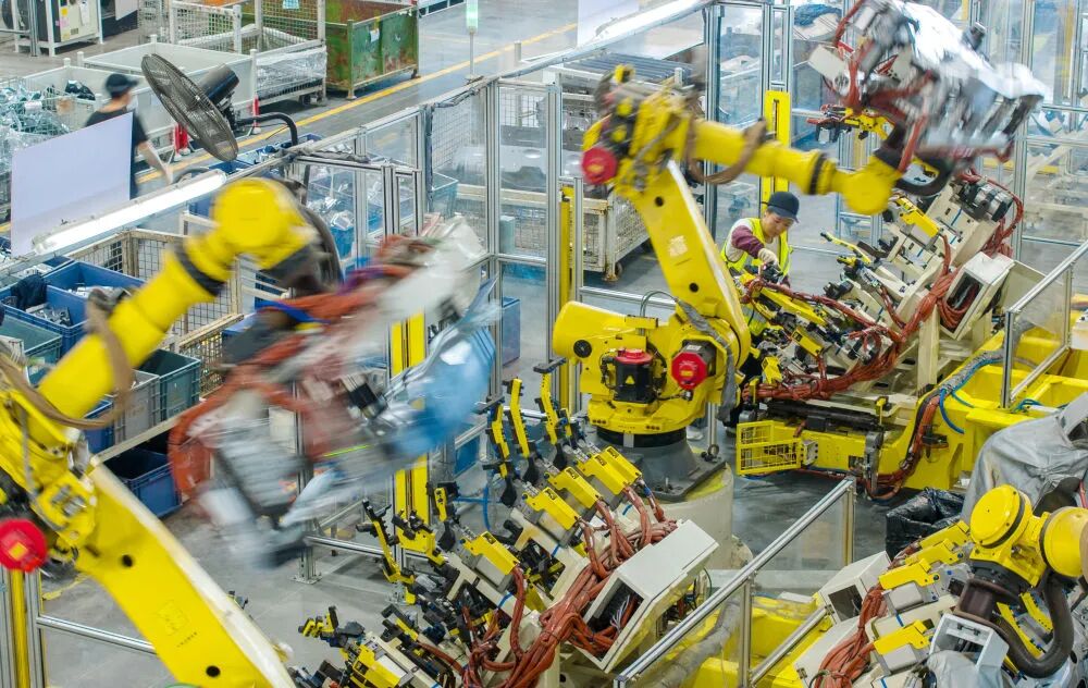 浙江省湖州市長興經濟技術開發區的長興地通汽車部件有限公司技術人員操控工業機器人生產新能源汽車配件(無人機照片,2025年10月9日攝)。新華社發(譚云俸 攝)