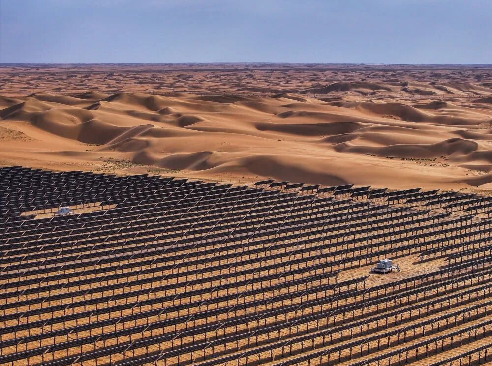這是2025年6月5日拍攝的位于內(nèi)蒙古巴彥淖爾市磴口縣的烏蘭布和東北部新能源基地100萬千瓦光伏先導(dǎo)工程項(xiàng)目(無人機(jī)照片)。該項(xiàng)目地處烏蘭布和沙漠。新華社記者 連振 攝